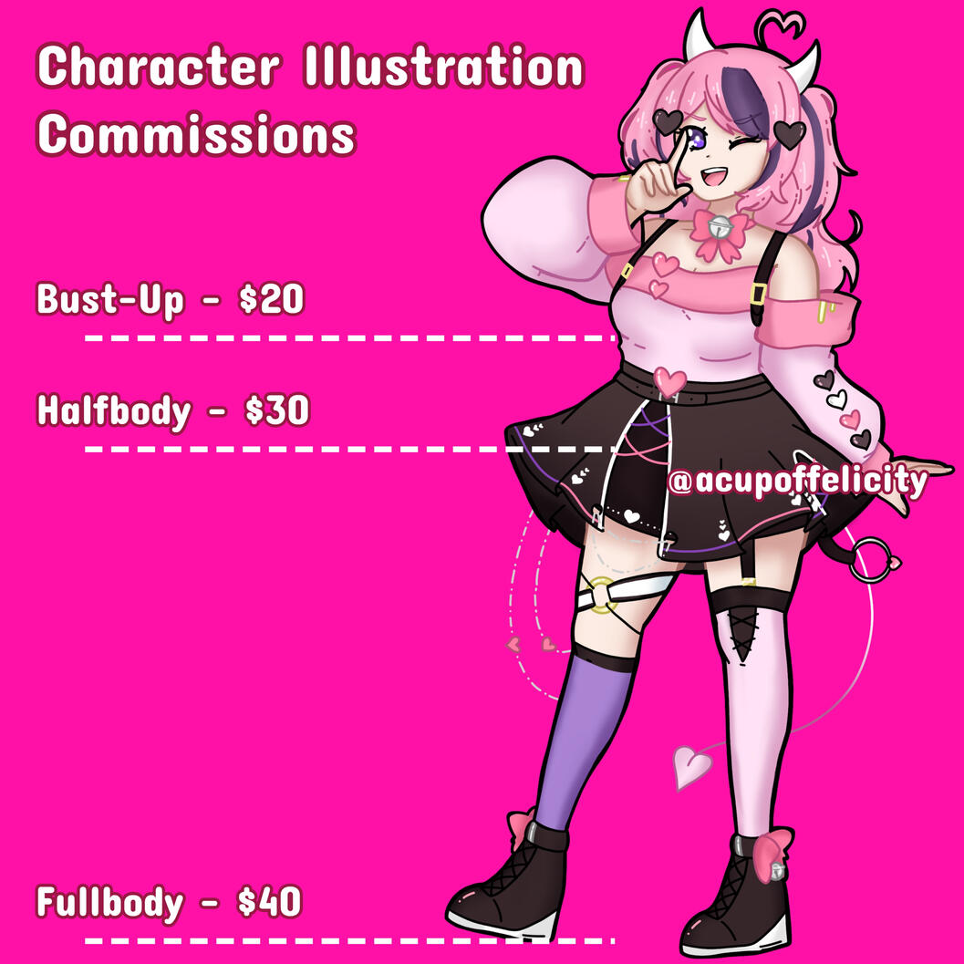 By commissioning me, you are agreeing to my terms of service.✧ I have the right to refuse any commission.✧ Payment comes first. I take payments through Paypal. USD ONLY.✧ Prices may change with the complexity of some props or designs or any additional characters.✧ The time I take to work on a commission can range from 3 weeks to 2 months. It will mostly depend on my personal projects, mental health, and work load.✧ If you want your commission done by a certain date (must be a reasonable amount of time for me to work) or be done sooner, you must pay an additional $10 fee for a priority slot. You're free to move your commission into a priority slot at any time except the final stage (usually coloring).✧ Feel free to ask for any updates!!✧ I will accept any minor revisions (ex: color change) at any time during the process. There is a limit of 2 major revisions (ex: pose change) that can be done.✧ Please do not get upset or angry with me during my time working, I can't handle other people being angry with me. I do not tolerate any form of disrespect and I will not do your commission for you.✧ I prefer to work with visual references. Written references will work to but if you have a visual reference I would prefer that more.✧ I will post the finished commission unless stated otherwise. Clients are allowed to post their commission.✧ Do not claim my artwork as your own, re-sell my work, edit my work, or sell my work as an NFT.✧ Please credit me if you use my artwork in public.
